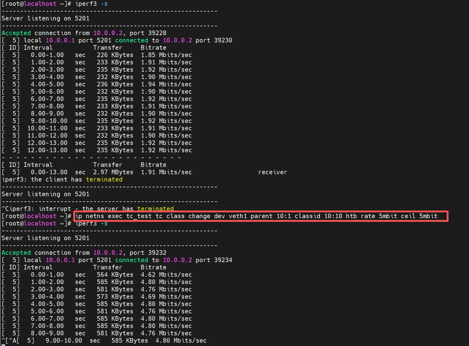 #服务端,默认监听5201 iperf -s #namespace内的veth2当客户端,打veth1 ip netns exec tc_test iperf3 -c 10.0.0.1 -t 100 -i 1