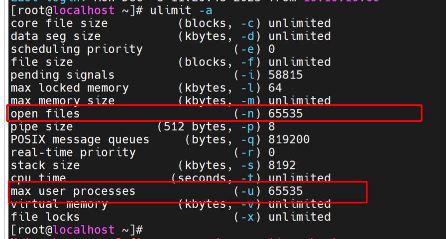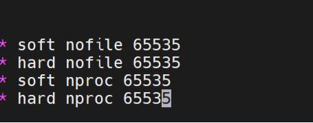 vim /etc/security/limits.conf * soft nofile 65535 * hard nofile 65535 * soft nproc 65535 * hard nproc 65535